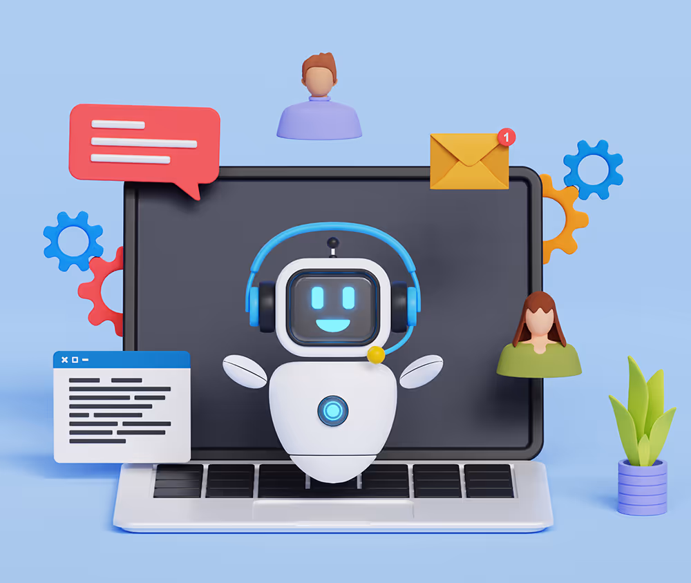 Robot interacting with multiple floating digital documents on a blue background.